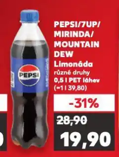 | 9 | PEPSI/7UP/ MIRINDA/ MOUNTAIN DEW Limonáda 0.5 L | Kaufland | 28,90 Kč | 19,90 Kč | -31% | 04 března 2026 | 10 března 2026 | Zobrazit nabídku | |