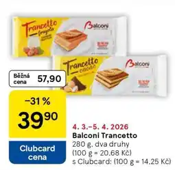 | Balconi Trancetto 280 g | Tesco | 57,90 Kč | 39,90 Kč | -31% | 07 května 2025 | 13 května 2025 | |