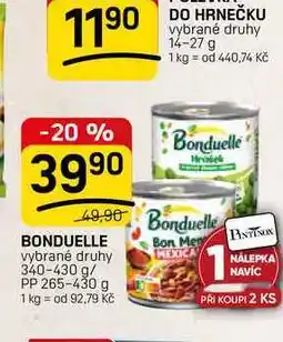 | BONDUELLE vybrané druhy 340-430 g/ PP 265-430 g | Flop | 49,88 Kč | 39,90 Kč | -20% | 22 dubna 2026 | 28 dubna 2026 | |