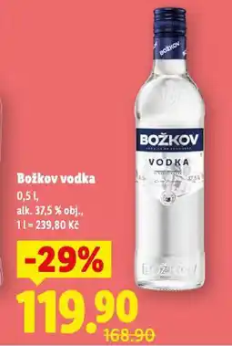 | BOŽKOV Vodka 0.5 L | Lidl | 158,90 Kč | 119,90 Kč | -24% | 14 října 2024 | 20 října 2024 | |
