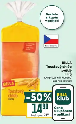 | BILLA Toustový chléb světlý 500 g | Billa | 29,90 Kč | 14,90 Kč | -50% | 21 ledna 2026 | 27 ledna 2026 | |