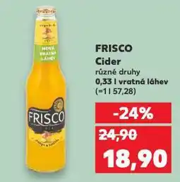 | 2 | Frisco cider | Kaufland | 24,90 Kč | 18,90 Kč | Sleva 24% | 28 ledna 2026 | 03 února 2026 | Zobrazit nabídku | |