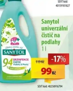 | Sanytol univerzální čistič na podlahy 1 L | SEVT | 119,00 Kč | 99,00 Kč | -17% | 20 listopadu 2025 | 31 prosince 2025 | |