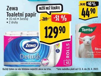 | Zewa deluxe toaletní papír | Albert | 269,00 Kč | 129,90 Kč | 139,10 Kč Slevu | 13 dubna 2022 | 19 dubna 2022 | |