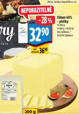 | Eidam 45% - plátky 200 g | Albert | 45,90 Kč | 36,90 Kč | -19% | 20 srpna 2025 | 26 srpna 2025 | |