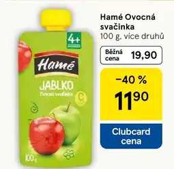 | Hamé Ovocná svačinka 100 g | Tesco | 19,90 Kč | 11,90 Kč | -40% | 14 ledna 2026 | 20 ledna 2026 | |