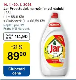 | Jar Prostředek na ruční mytí nádobí 1.35 l | Tesco | 114,90 Kč | 89,90 Kč | -21% | 14 ledna 2026 | 20 ledna 2026 | |