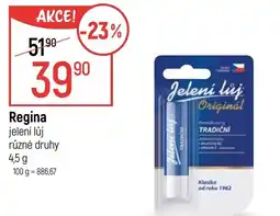| Regina jelení lůj 4.5 g | Globus | 51,90 Kč | 39,90 Kč | -23% | 22 října 2025 | 27 října 2025 | |