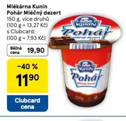 | Mlékárna Kunín Pohár Mléčný dezert 150 g | Tesco | 19,90 Kč | 11,90 Kč | -40% | 15 dubna 2026 | 21 dubna 2026 | |