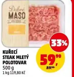 | KUŘECÍ STEAK MLETÝ POLOTOVAR 500 g | Penny Market | 89,40 Kč | 59,90 Kč | -33% | 15 dubna 2026 | 21 dubna 2026 | |