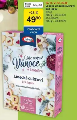 | Labeta Linecké cukroví bez lepku 255 g | Tesco | 66,90 Kč | 49,90 Kč | -25% | 26 listopadu 2025 | 02 prosince 2025 | |