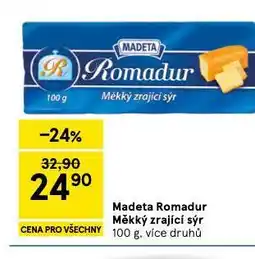 | 4 | Madeta Romadur Měkký zrající sýr 100g, různé druhy | Tesco | 24,90 Kč | 07 ledna 2026 | 13 ledna 2026 | Zobrazit nabídku | |||