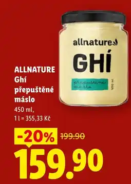 | ALLNATURE Ghí přepuštěné máslo 450 ml | Lidl | 199,90 Kč | 159,90 Kč | -20% | 30 dubna 2026 | 03 května 2026 | |