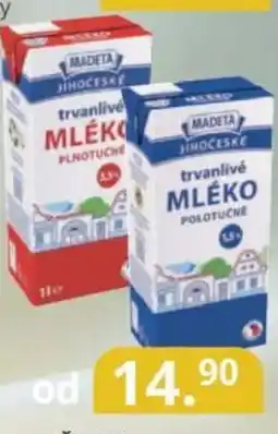 | Madeta Jč Mléko čerstvé polotučné, plnotučné 1,5%, 3,5% 1 L | Potraviny CZ | | 19,90 Kč | | 02 ledna 2026 | 12 ledna 2026 |