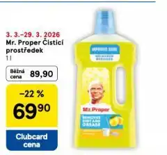 | 2 | Mr. proper čistící prostředek | Tesco | 89,90 Kč | 69,90 Kč | Sleva 22% | 04 března 2026 | 10 března 2026 | Zobrazit nabídku | |