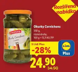 | Freshona Okurky Cornichons 330 g | Lidl | 34,90 Kč | 24,90 Kč | 10,00 Kč Slevu | 26 ledna 2026 | 28 ledna 2026 | |