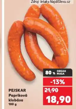 | Šunková klobása/ Papriková klobása 300 g | Kaufland | 64,90 Kč | 59,90 Kč | -7% | 12 listopadu 2025 | 18 listopadu 2025 | |