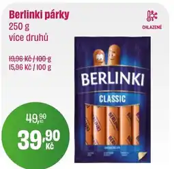 | Berlinki Classic párky 250 g | BonVeno | 49,90 Kč | 39,00 Kč | 10,90 Kč Slevu | 17 září 2025 | 07 října 2025 |