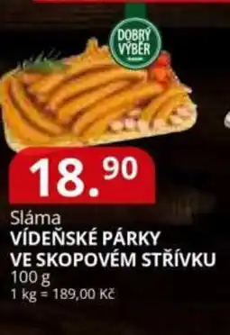 | Sláma Vídeňské párky ve skopovém střívku 100 g | Potraviny CZ | 18,90 Kč | 08 dubna 2026 | 20 dubna 2026 | |||