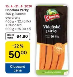 | Chodura Párky, 200 g, dva druhy | Tesco | 64,90 Kč | 04 února 2026 | 10 února 2026 | |||