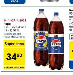 | Pepsi 2,25l 2.25l 2.25 l | Tesco | 34,90 Kč | 14 ledna 2026 | 20 ledna 2026 | |||