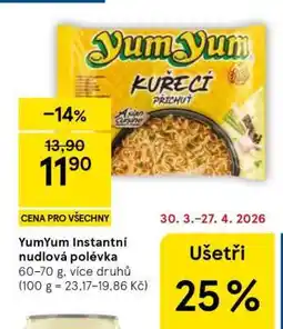 | Yum Yum Instantní nudlová polévka 60g, vybrané druhy 60 g | Tesco | 13,84 Kč | 11,90 Kč | -14% | 22 dubna 2026 | 28 dubna 2026 | |