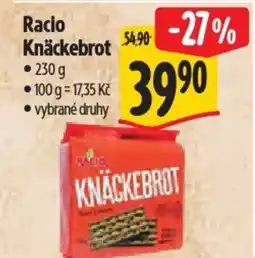 | 1 | Racio Knäckebrot 230 g | Albert | 54,90 Kč | 39,90 Kč | -27% | 15 dubna 2026 | 21 dubna 2026 | Zobrazit nabídku | |
