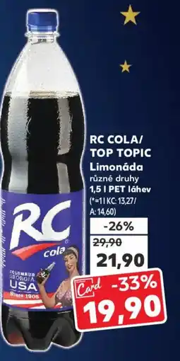 | RC COLA/ TOP TOPIC Limonáda 1.5 L | Kaufland | 29,90 Kč | 19,90 Kč | Card-33% | 05 února 2025 | 11 února 2025 | |