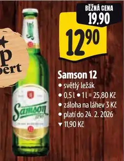| Pivo samson | Albert | 19,90 Kč | 12,90 Kč | Sleva 35% | 04 února 2026 | 10 února 2026 | |