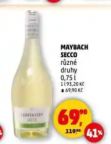 | Maybach secco chardonnay, merlot 0.75 L | Penny Market | 119,90 Kč | 69,90 Kč | 41% | 27 listopadu 2025 | 10 prosince 2025 | |