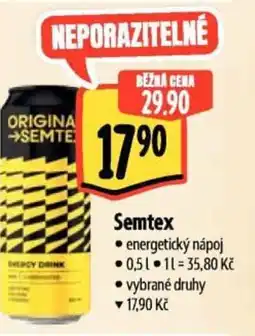 | Semtex energy drink | Albert | 34,90 Kč | 19,90 Kč | 15,00 Kč Slevu | 05 února 2025 | 11 února 2025 | |