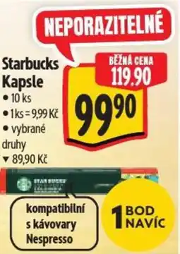 | 1 | Starbucks Kapsle | Albert | 119,90 Kč | 99,90 Kč | 20,00 Kč Slevu | 28 ledna 2026 | 03 února 2026 | Zobrazit nabídku | |