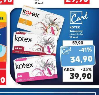 ![]() | Kotex tampony | Kaufland | 39,90 Kč | 35,90 Kč | 4,00 Kč Slevu | 08 února 2023 | 14 února 2023 |