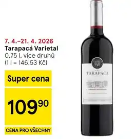 | Tarapacá Varietal, 0.75 l, více druhů | Tesco | 109,90 Kč | 18 března 2026 | 24 března 2026 | |||