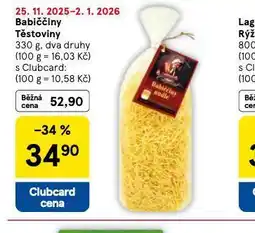 | Babiččiny Těstoviny, 330 g | Tesco | 52,90 Kč | 17 prosince 2025 | 24 prosince 2025 | |||