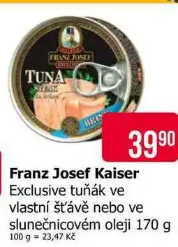 | Franz Josef Kaiser Exclusive tuňák ve vlastní šťávě nebo ve slunečnicovém oleji 170 g | Teta | 39,90 Kč | 12 února 2026 | 24 února 2026 | |||