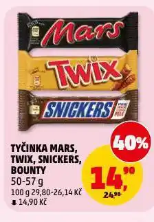 | 9 | Snickers, Mars, Twix, Bounty 36.5-57 g | Globus | 24,90 Kč | 14,90 Kč | -40% | 04 února 2026 | 02 března 2026 | Zobrazit nabídku | |