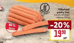 | Vídeňské párky z pultu lahůdek cena za 100 g | Billa | 19,90 Kč | 22 dubna 2025 | 27 dubna 2025 | |||