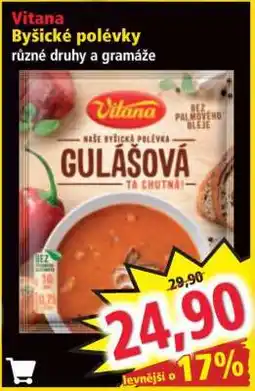 | Vitana byšické polévky | Norma | 29,90 Kč | 24,90 Kč | 5,00 Kč Slevu | 14 dubna 2025 | 20 dubna 2025 | |