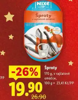 | 1 | Šproty | Lidl | 26,90 Kč | 19,90 Kč | 7,00 Kč Slevu | 22 prosince 2025 | 24 prosince 2025 | Zobrazit nabídku | |