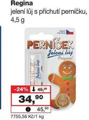 Nyní v nabídce u Barvy a laky drogerie: Regina jelení lůj s příchutí perníčku, 4,5 g ✅ Platné od 6-12 do 22-12.