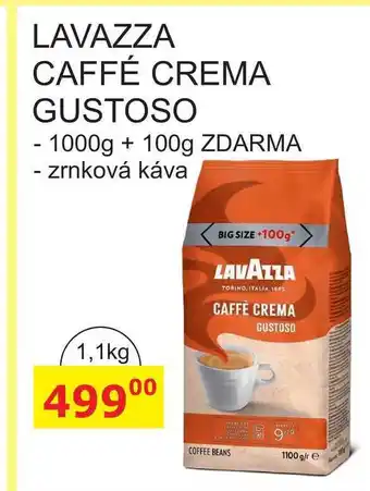 Cenu LAVAZZA CAFFÉ CREMA GUSTOSO 1000g + 100g najdete v horní části stránky spolu s informacemi o tom, kdy je nabídka k dispozici. Cenu si můžete také ověřit v aktuálním BENE Nápoje leták nebo na webových stránkách BENE Nápoje. Akční nabídky a nákupy za tu nejnižší cenu můžete také získávat díky pravidelnému sledování BENE Nápoje leták a jednotlivých Alkohol.