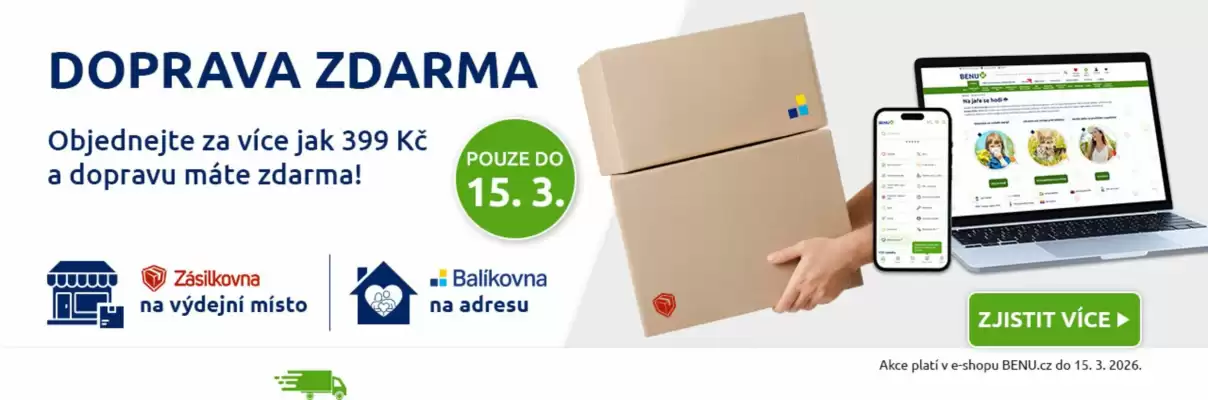 Prohlédněte si aktuální letáky společnosti Benu a plaťte vždy férovou cenu. Benu má 9 obchodů v ČR s pravidelnými týdenními akcemi. V nejnovějším Benu leták najdete informace platné od 01-03-2026 do 31-03-2026. Tento víkend zde objevíte 109 položek dostupných za výhodných podmínek. Nezapomeňte na leták s produkty jako: Luivac Immun, ESOXX® ONE perorální roztok a Pangrol 20000 IU! Benu má samozřejmě i další sortiment, který momentálně není součástí letáku. Tyto položky si můžete objednat online nebo vyzvednout v některém z odběrných míst či obchodů ve vašem okolí. Nejbližší prodejní místo snadno najdete pomocí vyhledávače v horní části stránky vedle vyhledávacího pole. Další informace, například otevírací doba obchodu, najdete také na stránkách Brno, Ostrava, Plzeň nebo na oficiálním webu Benu.