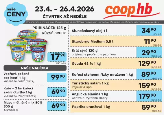 Prohlédněte si aktuální letáky společnosti Coop hb a plaťte vždy férovou cenu. Coop hb má 286 obchodů v ČR s pravidelnými týdenními akcemi. V nejnovějším Coop hb leták najdete informace platné od 22-04-2026 do 19-05-2026. Tento víkend zde objevíte 268 položek dostupných za výhodných podmínek. Nezapomeňte na leták s produkty jako: Zmrzka, Čiči Krmivo pro kočky a Sanytol univerzální dezinfekční čistič! Coop hb má samozřejmě i další sortiment, který momentálně není součástí letáku. Tyto položky si můžete objednat online nebo vyzvednout v některém z odběrných míst či obchodů ve vašem okolí. Nejbližší prodejní místo snadno najdete pomocí vyhledávače v horní části stránky vedle vyhledávacího pole. Další informace, například otevírací doba obchodu, najdete také na stránkách Brno, Praha, Babice nebo na oficiálním webu Coop hb.