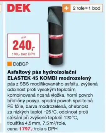 Nyní v nabídce u DEK: Asfaltový pás hydroizolační ELASTEK 45 KOMBI modrozelený ✅ Platné od 31-03 do 26-04.
