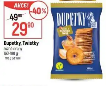 Dupetky, Twistky je tento týden u Globus dostupný se zajímavou slevou. Na této stránce najdete všechny informace o aktuální ceně, podmínkách akce a dalších speciálních nabídkách. Podívejte se i na další nabídky a akce související s Dupetky, Twistky, abyste měli jistotu, že získáte tu nejlepší možnou nabídku.