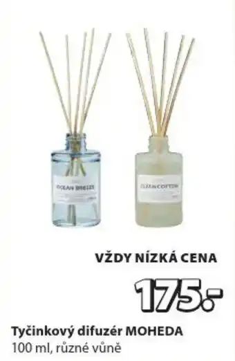 Tyčinkový difuzér MOHEDA je nyní v akci u JYSK, platí od 15-04-2026 do 26-05-2026. Podívejte se na aktuální nabídky JYSK pro více výhodných akcí. Objednejte si Tyčinkový difuzér MOHEDA online přes webové stránky JYSK nebo nakupujte za výhodnou cenu v pobočce poblíž vás. Na Akcniletak.cz vždy najdete ty nejlepší nabídky na Tyčinkový difuzér MOHEDA.