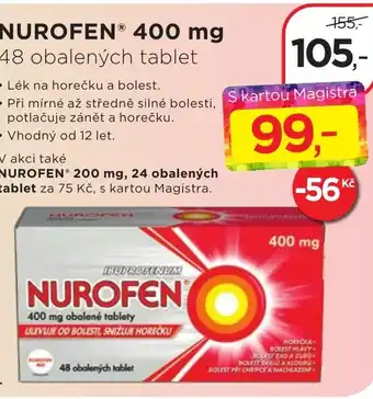 Cenu NUROFEN® 400 mg najdete v horní části stránky spolu s informacemi o tom, kdy je nabídka k dispozici. Cenu si můžete také ověřit v aktuálním Magistra lékárny leták nebo na webových stránkách Magistra lékárny. Akční nabídky a nákupy za tu nejnižší cenu můžete také získávat díky pravidelnému sledování Magistra lékárny leták a jednotlivých Kosmetika & Zdraví.
