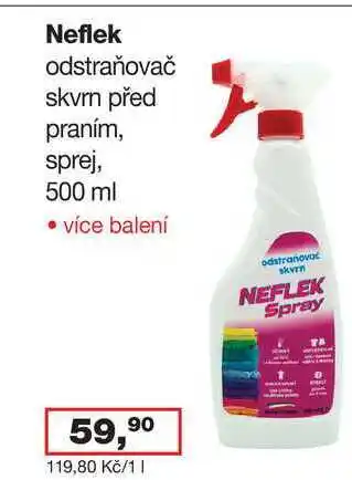 Ráj drogerie nabízí kromě Neflek široký výběr nových i oblíbených produktů. Sledujte týdenní leták Ráj drogerie leták, kde najdete nejlepší nabídky a akce. Kromě Neflek můžete najít také následující nabídky: Neflek odstraňovač skvrn před praním, sprej, Neflek odstraňovač skvrn bílé+barevné prádlo a Neflek odstraňovač skvrn bilé+barevné prádlo 500 ml. Prohlédněte si také další Kosmetika & Zdraví, ať vám neuniknou ty nejlepší ceny.