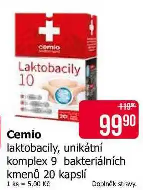 Tato cemio laktobacily, unikátní komplex 9 bakteriálních kmenů 20 kapslí je aktuálně v nabídce u Teta. Veškeré informace o cenách, podmínkách akce a době platnosti najdete přímo na této stránce. Prohlédněte si také další podobné nabídky a akce související s cemio laktobacily, unikátní komplex 9 bakteriálních kmenů 20 kapslí, abyste vždy zvolili tu nejvýhodnější možnost.